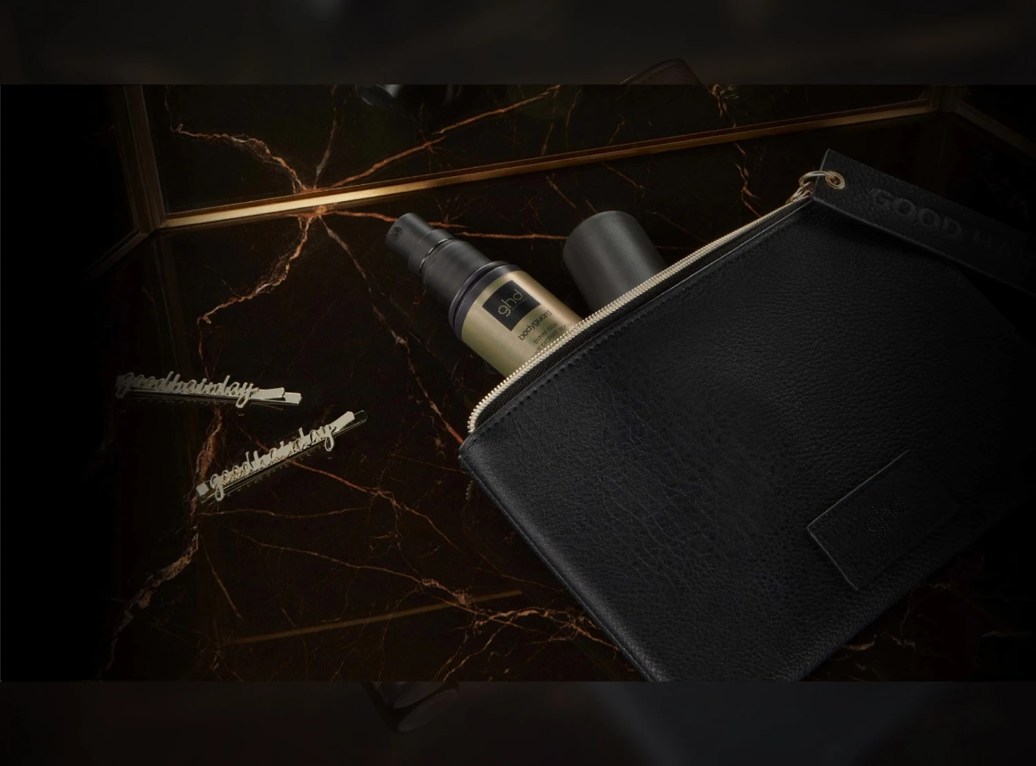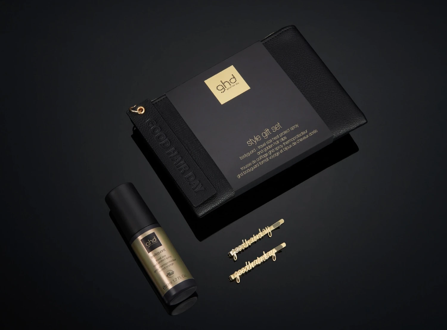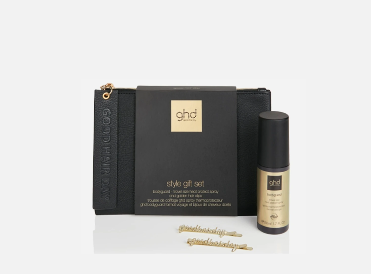 style gift set ghd con pochette nera, spray termoprotettore bodyguard travel size e 2 clip per raccogliere i capelli dorate