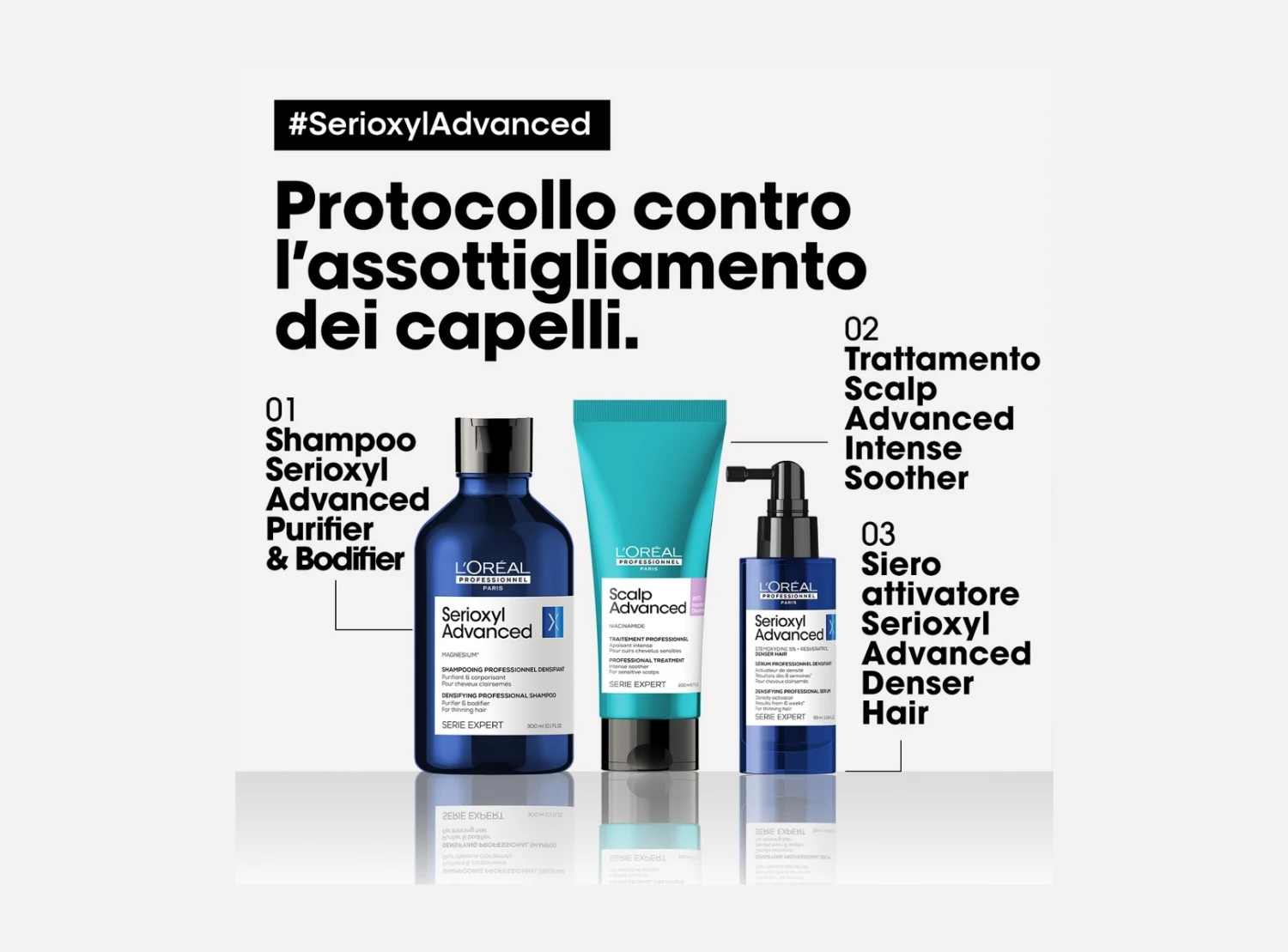 La formula è sensibile alla luce, per risultati ottimali, si consiglia di applicare il siero densificante Serioxyl Advanced la sera su capelli lavati e tamponati