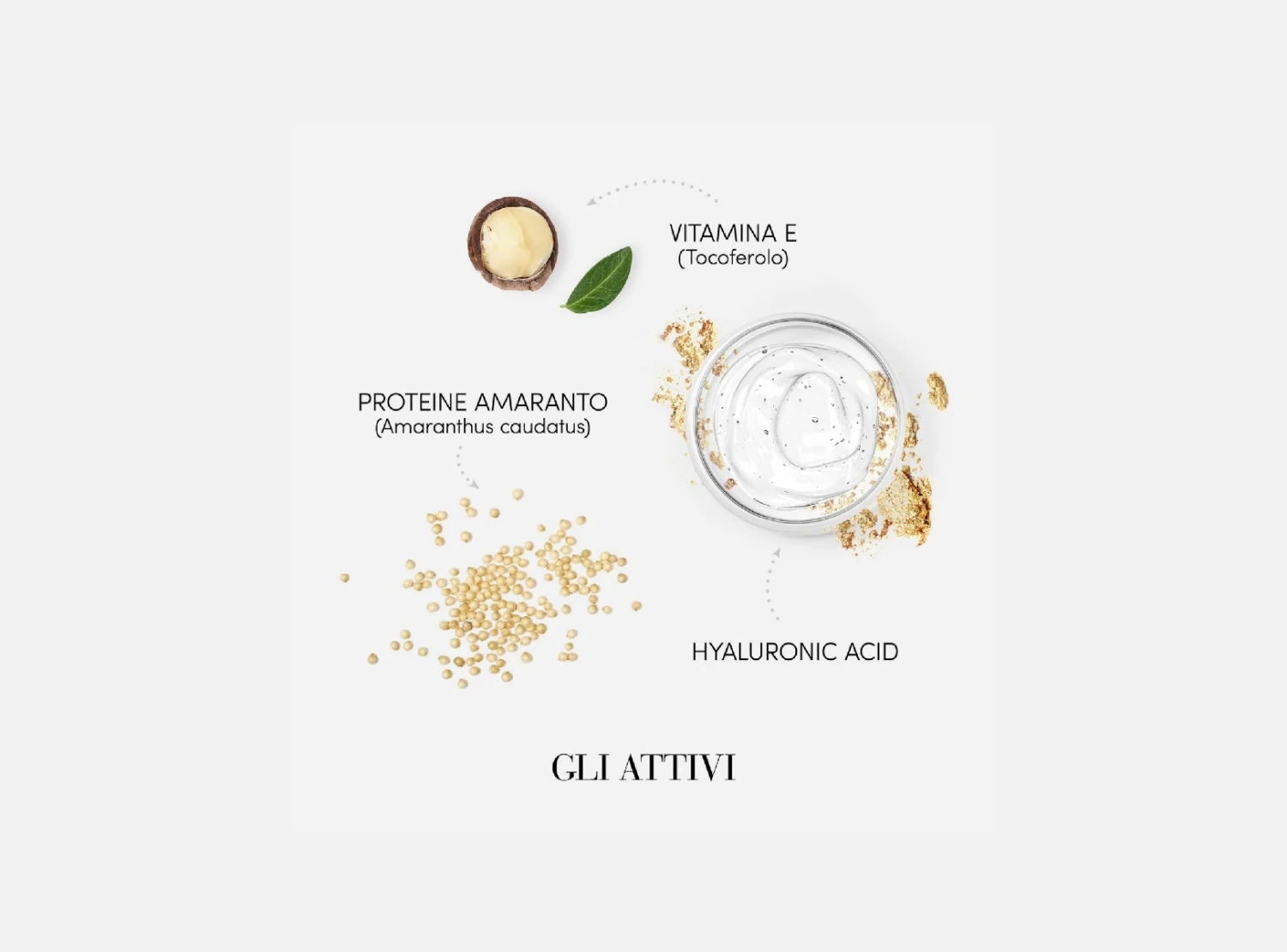 Con Collagene idrolizzato, Acido ialuronico, proteine di Amaranto, un complesso di Ceramidi e il complesso di aminoacidi Amino Concentré.