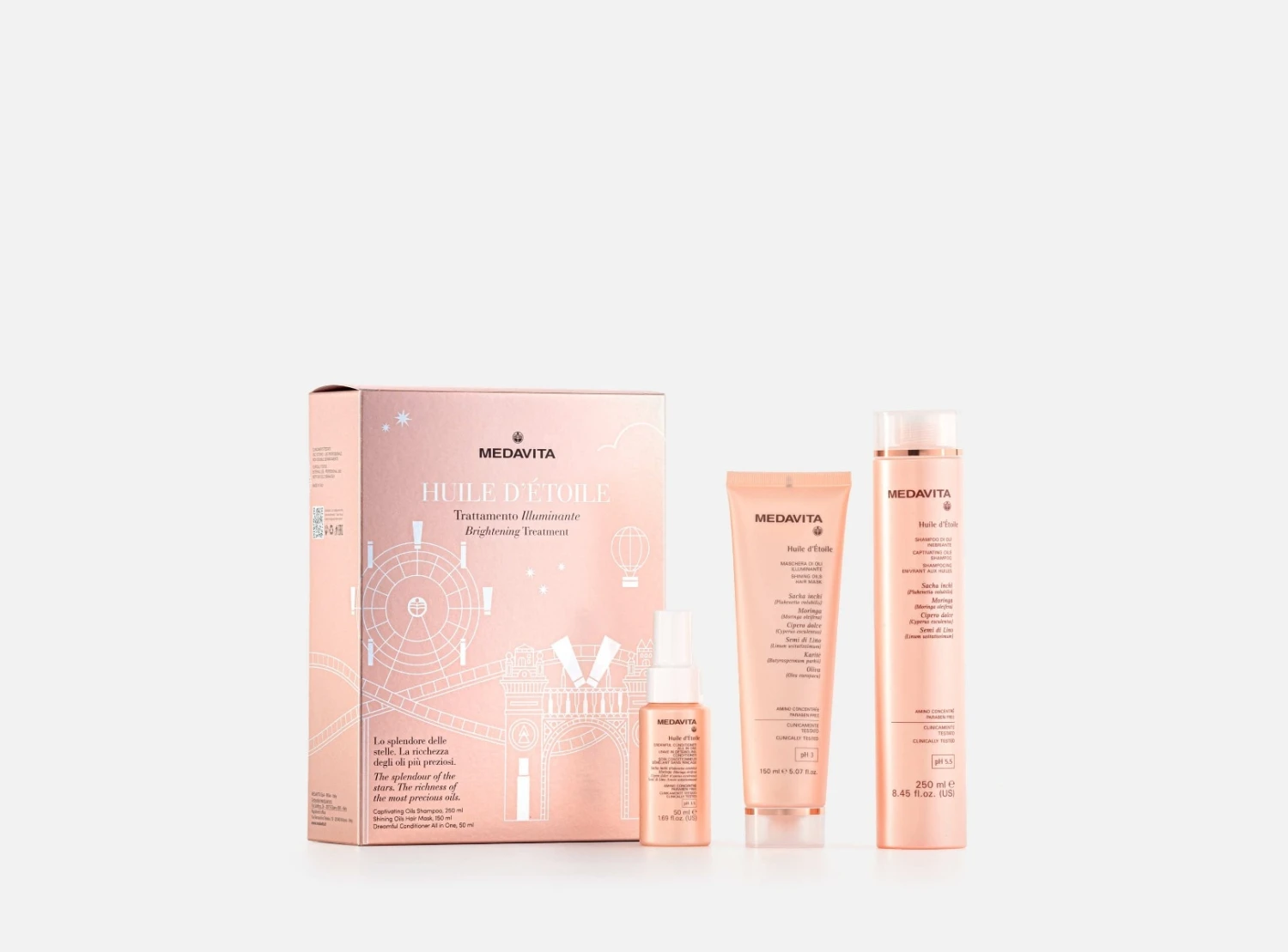 | Contenuto Confezione | • Medavita Huile D’Etoile Shampoo di oli inebriante 250 ml • Medavita Huile D’Etoile Maschera di oli inebriante 150 ml • Medavita Huile D’Etoile Dreamful Conditioner All In One 50 ml |