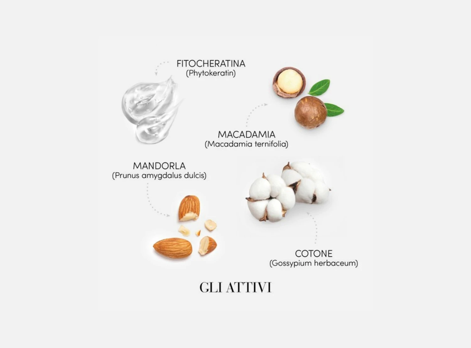 • Fitocheratina: rinforza e protegge a capelli dai danni dello styling, ne migliora l’elasticità e li rende più pettinabili, protegge dall’effetto crespo e dall’accumulo di elettricità statica
