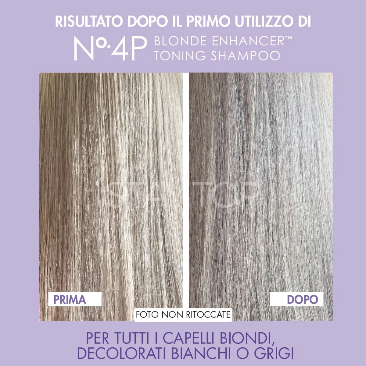 Olaplex n°4P Blonde Enhancer Toning Shampoo è uno shampoo ristrutturante pigmentato viola che ristruttura e tonalizza immediatamente i capelli biondi, decolorati, bianchi o grigi.