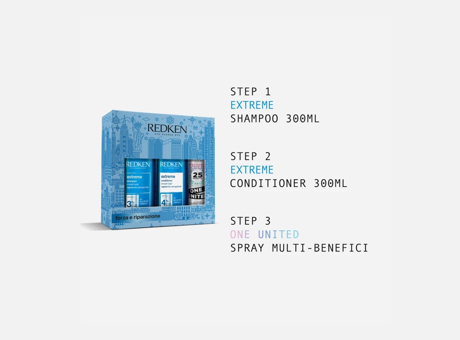 | Contenuto Confezione | • Redken Extreme Shampoo 300 ml • Redken Extreme Conditioner 300 ml • Redken One United Treatment 150 ml |